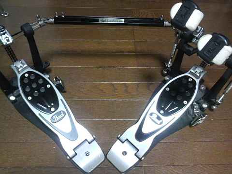 老舗メーカーPearl製ツインペダル。ツインの利点は速いフレーズを無理ムラなく表現できることで、ダブルアクションで演奏していたフレーズを、ツインで両足を使って踏むと明らかに音の粒が違ってきます。